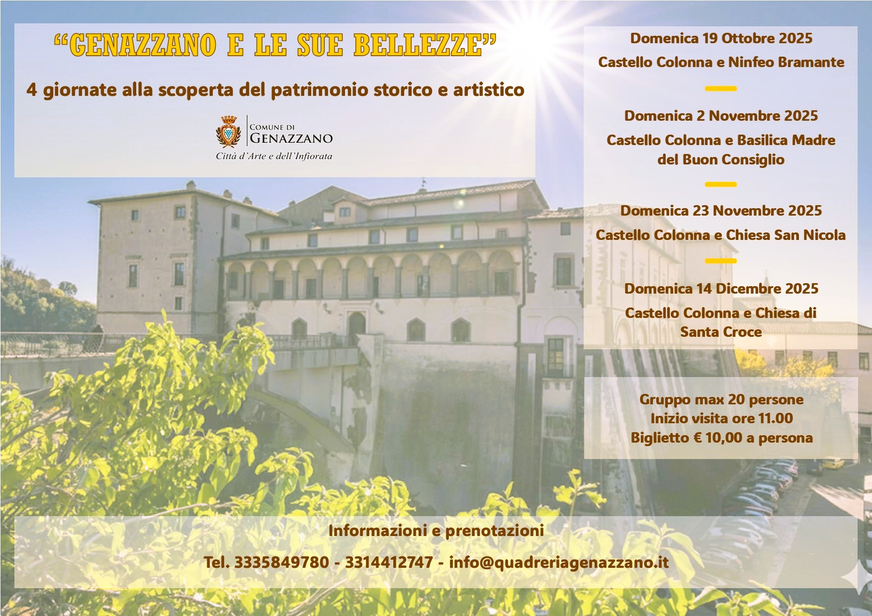 Il Comune di Genazzano, Città d’Arte e dell’Infiorata, invita cittadini e visitatori a partecipare all’iniziativa “Genazzano e le sue bellezze”, un ciclo di quattro giornate dedicate alla scoperta del patrimonio storico, artistico e religioso del territorio.