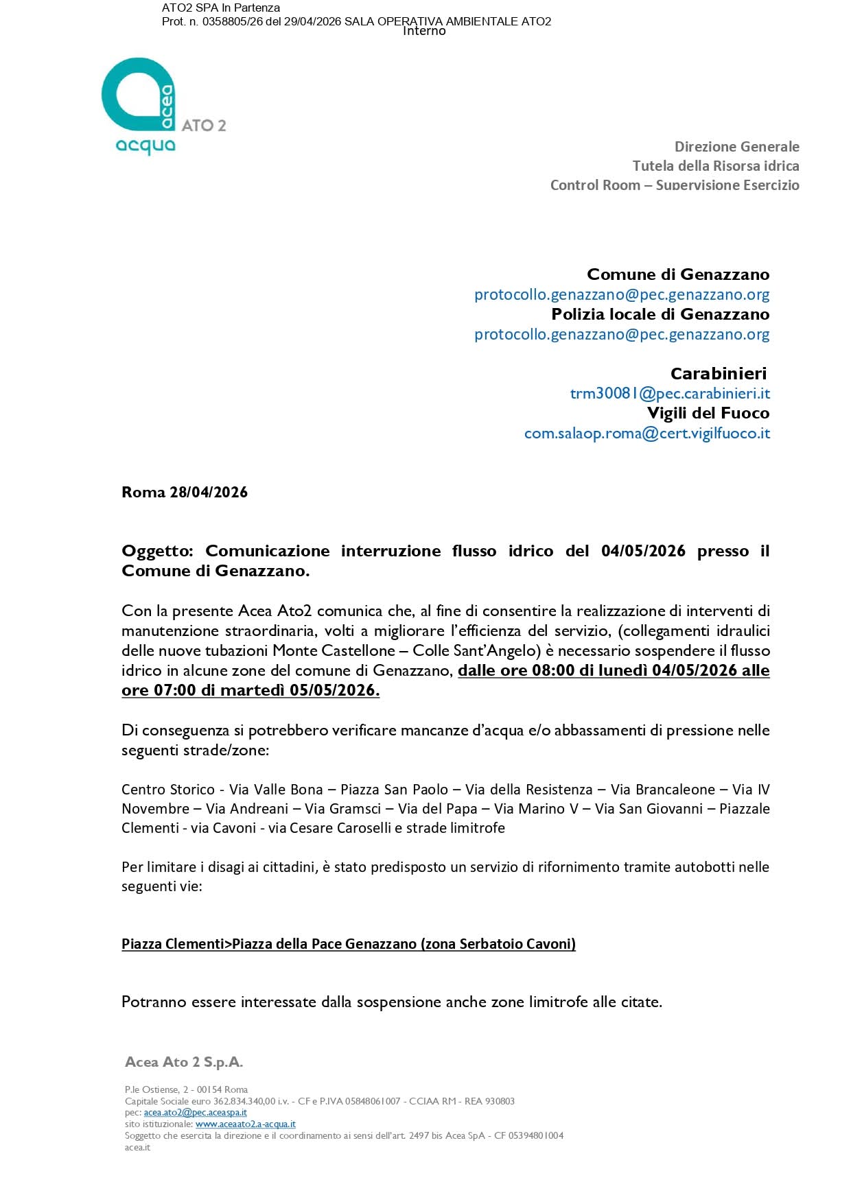Acea Ato2 comunica che, al fine di consentire la realizzazione di interventi di manutenzione straordinaria, volti a migliorare l’efficienza del servizio, (collegamenti idraulici delle nuove tubazioni Monte Castellone – Colle Sant’Angelo) è necessario sospendere il flusso idrico in alcune zone del comune di Genazzano,